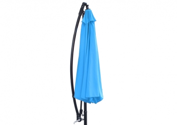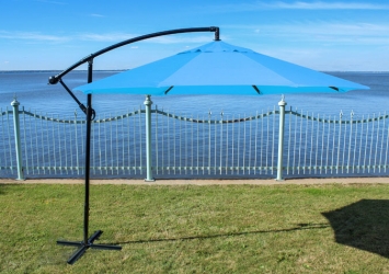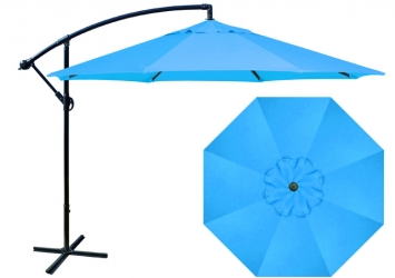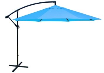 10 foot offset blue octagonal Patio Promo garden umbrella. This practical model reaches easily over an outdoor dining table, sofa seating set or series of lounge chairs without having the post get in the way. The crossed shaped base with strategically placed holes allows anchoring in to decks and other surfaces as well as allowing to place weights between the bars to stabilize your umbrella. Weighted bases and anchors sold separately.