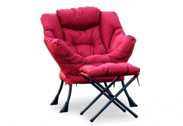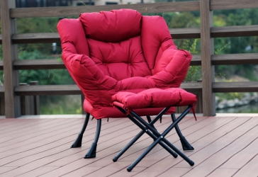 Bella patio chair set with red cushions and Ottoman. Includes a one year warranty against manufacturing defects.