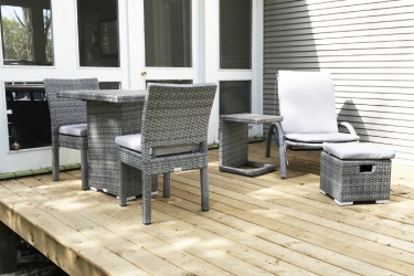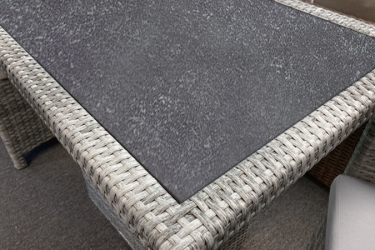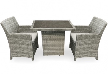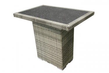 Condo Stone Grey outdoor furniture patio dining table with ceramic slate stone finish looking tempered glass top for balcony or small deck area. Chairs sold separately. If you have a smaller space to enhance, here's the perfect choice. A compact and highly practical outdoor dining table, ideal for serving breakfast or intimate suppers for two. Specifically designed for use on a balcony, smaller terrace or confined garden area. The Condo patio dining table will make your space cozy, refined and more intimate. Includes a 2 year warranty on the structure and the synthetic realistic looking wicker.