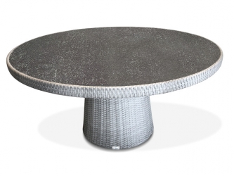 Delia Stone round patio dining table made with a warm grey realistic looking synthetic wicker and faux stone ceramic slate looking tempered glass top. Note: Chairs sold separately. Also features an aluminum structure that won't rust. This unique looking outdoor table is sold separately, but can be matched with Tecla Stone chairs by Ogni and can comfortably seat from 4 to 7 people. Includes a 2 year warranty on the aluminum structure, the wicker and the table top.
