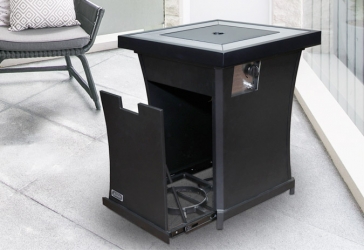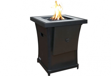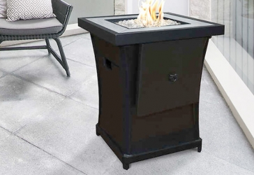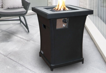 Dunham vertical black outdoor fire pit table. Made with an aluminum structure that won't rust and a stainless steel burner element. Can generate up to 50,000 BTU. Will run up to an average of 8 hours on one standard 9.1 kg ( 20 lbs ) full propane tank. Propane tank excluded.