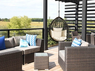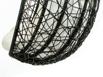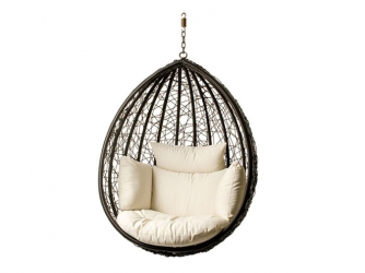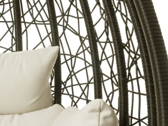 The Escape hanging chair by Ogni, shown here without frame, simply hangs from a hook indoors or outdoors. You can hang it in a tree or from a safe and solidly anchored eyelet or even hook it on your patio structure. The chair structure is made of aluminum that won't rust, and the wicker has an additive throughout that will provide a better resistance to damaging UV sunlight. The standard stock cushion colour available is ivory. This unique new addition to the Ogni line of products is now available at our participating retail locations. Designed for a maximum weight support of 200 kg ( 440 lbs ). A separate heavy-duty metal hanging frame is available with added price, to hang this chair onto, if needed. See stores for details. This unique quality-made outdoor hanging chair includes a 2 year warranty on the aluminum structure and the synthetic wicker.