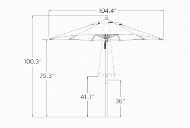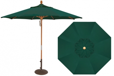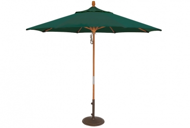 Forest Green 9 foot wide hardwood frame patio umbrella by Treasure Garden. Made with an aluminum 4 pulley system that won't rust and easy-to-use ropes to open and close the umbrella, as well as a fixed-position solid hardwood non-tiltable center pole measuring 1.5 inches in diameter and 101 inches in total height excluding base. Includes a 1 year warranty on the wooden structure and a 4 year warranty against discoloration of the Treasure Garden O'Bravia brand fabric. A 50 lbs base is recommended for use with this model. Base sold separately.