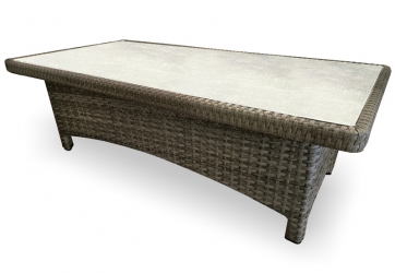 Java brown outdoor rectangular durable synthetic wicker coffee table by Ogni, featuring à durable natural slate stone looking tempered glass top. Offered with a 2 year warranty on the aluminum frame and the realistic synthetic UV treated wicker.