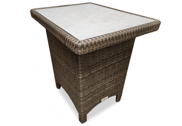 Java brown outdoor rectangular durable synthetic wicker coffee table by Ogni, featuring à durable natural slate stone looking tempered glass top. Offered with a 2 year warranty on the aluminum frame and the realistic synthetic UV treated wicker.