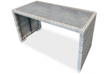 Joey Stone grey outdoor rectangular coffee table made by Ogni with tempered glass Natural Slate looking surface, offered with a 2 year warranty on the aluminum frame and the synthetic UV treated wicker.