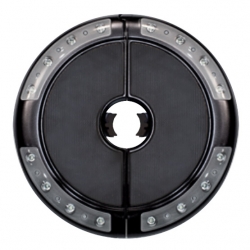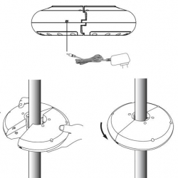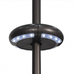 LED patio umbrella light Bluetooth speaker with black casing. Charge it indoors in a nice dry place, and then take it outdoors to click onto your patio umbrella center stand to play your favorite music and light-up your outdoor table surface at the same time. Maximum diameter of umbrella stand should not exceed 2 inches. Includes power converter/charger