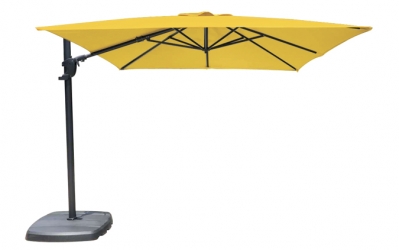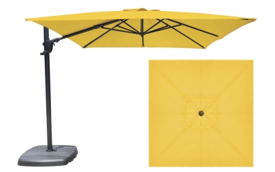 AG15 Lemon yellow square 10 foot offset patio umbrella by Treasure Garden with very durable O'Bravia fabric and an aluminum structure. Includes a 4 year against the discoloration of the fabric and 1 year on the Aluminum structure that won't rust. Several weighted base options as well as concrete, wood and other anchoring options are available but sold separately.