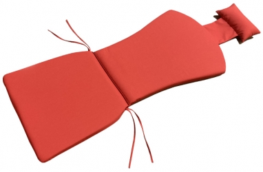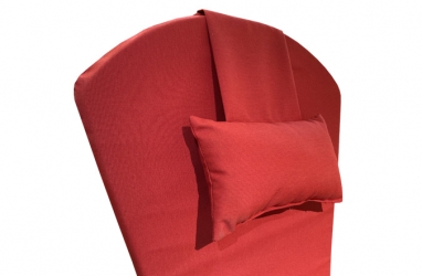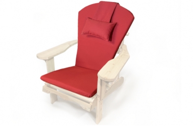 Made in Canada, Red outdoor Adirondack chair cushion with Sunbrella™ fabric and adjustable head rest pillow. You can position the neck pillow for the perfect height of your head or neck. The comfortable foam padding is 2 inches thick. This unique cushion also features fabric string ties on each side to fasten your cushion securely to your chair. It will fit our standard and rocking Adirondack chair models, as well as the greater majority of Adirondack chairs sold on the market. Made in Canada. Includes a 5 year warranty agains the discoloration of the Sumbrella™ fabric. Chair sold separately. Dimensions: The seat is 19" x 19" and the back section height is 31" • The thickness of the cushion is 2" ( 6.35cm )