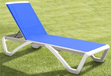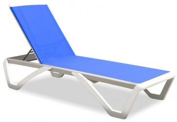 Miami white resin lounge chair with blue sling fabric. One year warranty against manufacturing defects.