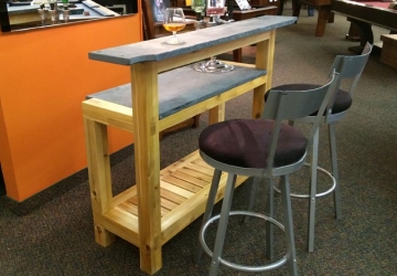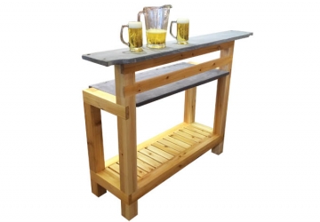 Outdoor bar made of Canadian White Cedar in our custom shop near Montreal Quebec Canada, by our highly skilled craftsmen. This bar table is equipped with two re-purposed billiard slate tops, one lower surface used for preparation, and the other for serving drinks. It also features a slick looking bottom shelf.
