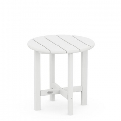 Polywood recycled White plastic round outdoor 18 inch side end table. Manufactured with 99% repurposed plastic to minimize the environmental impact and carbon footprint but with a 20 year manufacturer warranty by the reputable Polywood company. These products have been time-tested on the market since 1990. Stain, corrosion, chip, peel and weather resistant. Easy to maintain and clean with a simple dish soap and water solution. Available in a multitude of colours. Price shown here is for this model in White. Prices for other colours may vary.