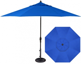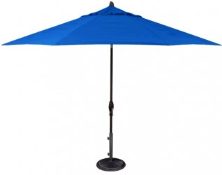Quality 335cm ( 11 foot ) Cobalt Blue outdoor garden patio umbrella made by Treasure Garden. This stylish neutral and contemporary looking parasol features an easy-to-use auto-tilt articulation and manual crank type mechanism that needs minimal effort to tilt, open and close. The top is vented to reduce the risk of damage by strong gusts of wind. It has a classic, durable aluminum frame. Weighted base sold separately. Two (2) year warranty on the frame structure and four (4) years against the discoloration of the Treasure Garden O'Bravia ® fabric.