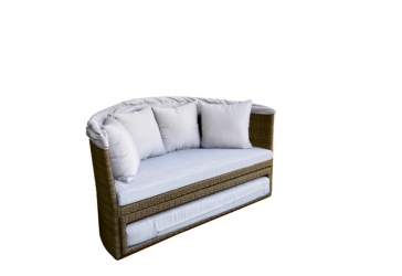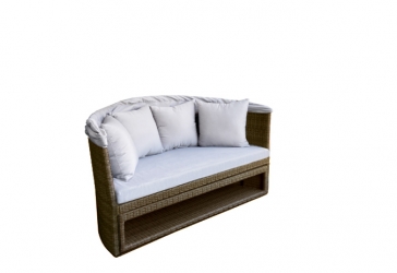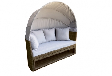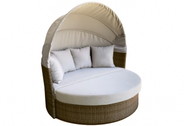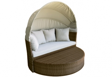 Solea day bed in Java Brown with retractable canopy. Made by Ogni with a strong aluminum structure that won't rust, covered with a realistic very natural looking synthetic wicker. The Ottoman footrest retracts into the base along with its cushion. An design element for your outdoor entertainment that will stand out with a fresh elegant style.