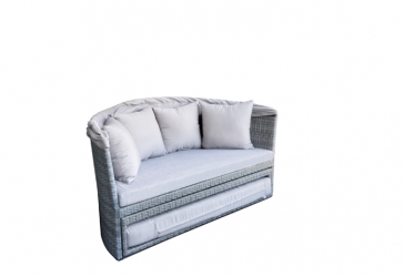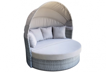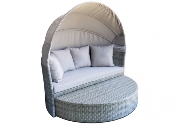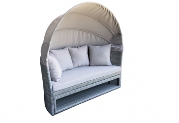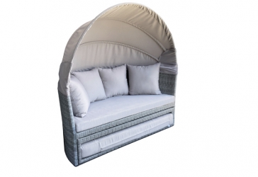 Solea day bed in Stone Grey with retractable canopy. Made by Ogni with a strong aluminum structure that won't rust, covered with a realistic very natural looking synthetic wicker. The Ottoman footrest retracts into the base along with its cushion. An design element for your outdoor entertainment that will stand out with a fresh elegant style