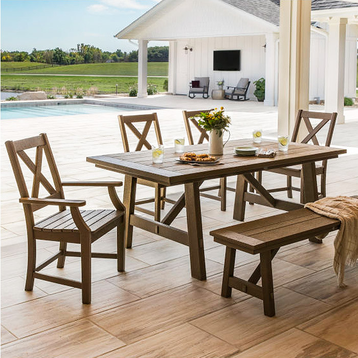 Teak coloured Polywood recycled plastic outdoor armrest dining chair. Manufactured with 99% repurposed plastic to minimize the environmental impact and carbon footprint but with a 20 year manufacturer warranty by the reputable Polywood company. These products have been time-tested on the market since 1990. Stain, corrosion, chip, peel and weather resistant. Easy to maintain and clean with a simple dish soap and water solution. Available in a multitude of colours. Price shown here is for this model in Teak Brown. Prices for other colours may vary.