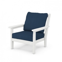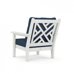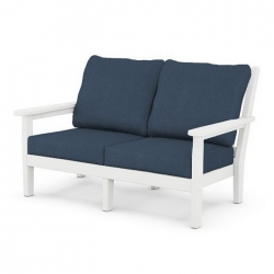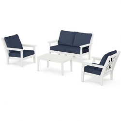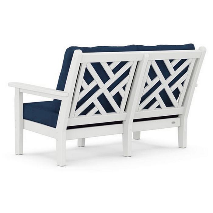 White Polywood Chippendale deep seating recycled plastic outdoor 4-piece, 4-seat furniture set. Manufactured with 99% repurposed plastic to minimize the environmental impact and carbon footprint but with a 20 year manufacturer warranty by the reputable Polywood company. These products have been time-tested on the market since 1990. Stain, corrosion, chip, peel and weather resistant. Easy to maintain and clean with a simple dish soap and water solution. Quick-drying, durable cushions covered in all-weather performance fabric that resists moisture, salt, sun, mold, and mildew. Includes 1 Loveseat, 2 Chairs and 1 coffee Table. Sold here and presently stock in White with Navy cushion fabric but also available as special order in a multitude of colours. Price shown here is for this model in White. Prices for other colours may vary.