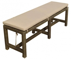 Banc pour table à dîner patio, conçue en aluminium qui ne rouillera pas et recouvert de rotin synthétique très réaliste avec additif pour UV. Incluant le coussin standard de couleur taupe et une garantie de 2 ans sur la structure et son rotin. Autres housses ou couleurs de coussins sont disponibles avec ajout de prix relatif au grade et couleur du tissu.