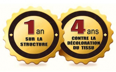 Ce parasol de jardin gris de qualité inclut une garantie de 4 ans contre la décoloration du tissu et 1 an sur la structure en aluminium qui ne rouillera pas.