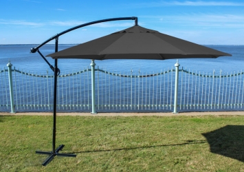 Parasol de jardin octogonal 10 pieds noir décentré Patio Promo. Ce modèle déporté permet un placement facile sans encombrement par dessus une table à dîner extérieur, un ensemble de causeuse ou bien une série de chaises longue. La base en acier en forme croisée, trouée stratégiquement permet de boulonner au surfaces ou d'affixé des pesées lourdes pour bien garder le parasol en place. Bases à pesé lourdes et systèmes de boulonnage vendus séparément.