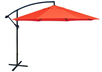 Parasol de jardin octogonal 10 pieds rouge décentré Patio Promo. Ce modèle déporté permet un placement facile sans encombrement par dessus une table à dîner extérieur, un ensemble de causeuse ou bien une série de chaises longue. La base en acier en forme croisée, trouée stratégiquement permet de boulonner au surfaces ou d'affixé des pesées lourdes pour bien garder le parasol en place. Bases à pesé lourdes et systèmes de boulonnage vendus séparément.