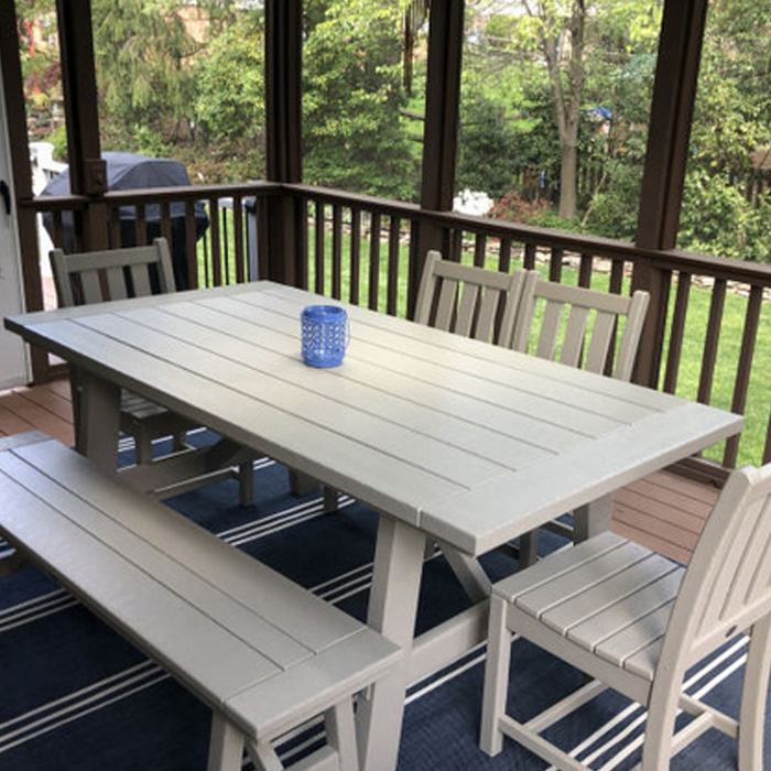 Table à dîner extérieure Polywood Farmhouse rectangulaire couleur brun Teck en plastique recyclé. Conçue avec 99% de matériaux plastique récupérés pour minimiser l'impact environmental et garantie 20 ans par le manufacturier renommé Polywood. Ces produits de qualité ont fait leurs preuves sur le marché depuis 1990. Ils sont à l'épreuve de taches, des écailles, la corrosion et des intempéries. Facile d'entretien et peuvent être lavés avec de l'eau et du savon lave-vaisselle. Le prix affiché est pour ce modèle en Brun Teck. Prix peuvent variés selon la couleur.