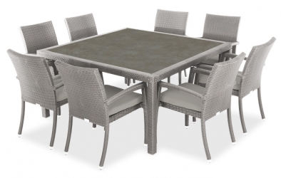 ​Table de jardin Nico Stone 8 places pour dîner patio terrasse avec dessus en verre trempé d'aspect peierre ardoise céramique. Note: Chaises vendues séparément. Fabriquée entièrement avec une structure robuste en aluminium soudé recouverte d'un poly-rotin synthétique très réaliste avec additif pour protégé contre les effets UV du soleil. Celle-ci est à la fois neutre, classique et moderne pour s'agencer avec presque n'importe quel décor extérieur. Elle est munie d'une surface de table en composé céramique simili pierre ou ardoise très durable. Idéal pour y placer 8 chaises ( chaises vendues séparément ). Facile à nettoyer. Inclut une garantie de 2 ans sur la structure en aluminium qui ne rouillera pas et 2 ans sur le poly-rotin.