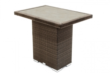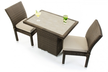 Table à dîner patio Condo Brun Java pour balcon, terrasse ou jardin avec dessus en verre trempé d'aspect céramique. Chaises vendues séparément. Vous avez un plus petit espace à compléter? Voilà une table pratique et compact idéal pour vos besoins. Un choix parfait pour servir le petit déjeuner ou soupers intimes à deux. Conçue pour balcons et petites terrasses, cette table à dîner pourra faire de votre espace un endroit plus raffiné et intime. Garantie de 2 ans sur la structure et sur le rotin synthétique. La table mesure 61 cm L x 92 cm P x 73 cm H ( 24" L x 36" P x 30" H ), la profondeur avec deux chaises ( chaises vendues séparément ) serait approximativement 224 cm ( 88" ).