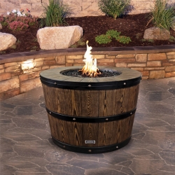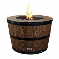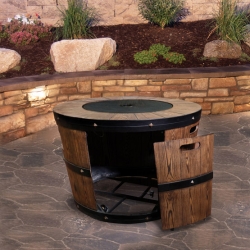 Table de feu foyer extérieur en forme baril de vin. Fabriquée en composé unique de béton et époxy avec une aspect de bois unique. Peut générer jusqu’à 50,000 BTU de chaleur par source de propane par défaut ou avec une source de Gaz Naturel avec un ajour de trousse de conversion vendue séparément.