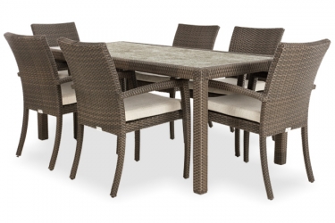 Table de jardin Ciro Brun Java 6 places pour dîner patio terrasse. Note: Chaises vendues séparément. Fabriquée entièrement avec une structure robuste en aluminium soudé recouverte d'un poly-rotin synthétique très réaliste avec additif pour protégé contre les effets UV du soleil. Elle est munie d'une surface de table en verre trempé d'aspect céramique simili pierre ou ardoise très durable et facile à nettoyer. Idéal pour y placer 6 à 8 chaises selon la largeur de la chaise ( chaises vendues séparément ). Inclut une garantie de 2 ans sur la structure en aluminium qui ne rouillera pas et 2 ans sur le poly-rotin.