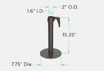 Tige de base de parasol jardin pour boulonnage directement sur le bois tel-quel ou pour boulonnage au sol et béton avec trousses additionnelles. Aide à économiser de l'espace de pieds en dessous de votre table ou surface de montage pour éviter d'utiliser les bases à pesées lourdes plus volumineuse et encombrantes remplies d'eau ou sable. Très robuste construction, idéal pour endroits venteux comme les quais. Voir trousses recommandées dans le bas de la page. Boulons et trousses de montages béton et sol vendues séparément. Voir produits suggérés ci-dessous pour montage sur différentes surfaces.